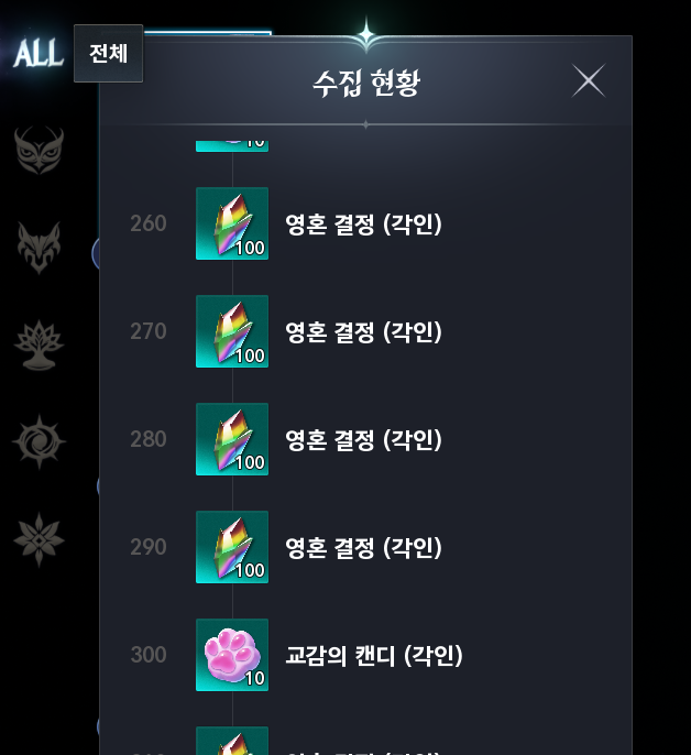 - 결정은 업적 보상 또는 이해도 5레벨 펫 추가 사냥 시 획득