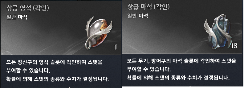 마석과 영석은 캐릭터의 전투력을 올리는 핵심 성장 요소입니다.