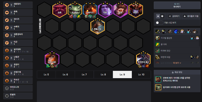 - 빌지워터 시너지로 금화 수급이 빠르므로 8레벨 이후에는 가능한 한 빠르게 9레벨 진입