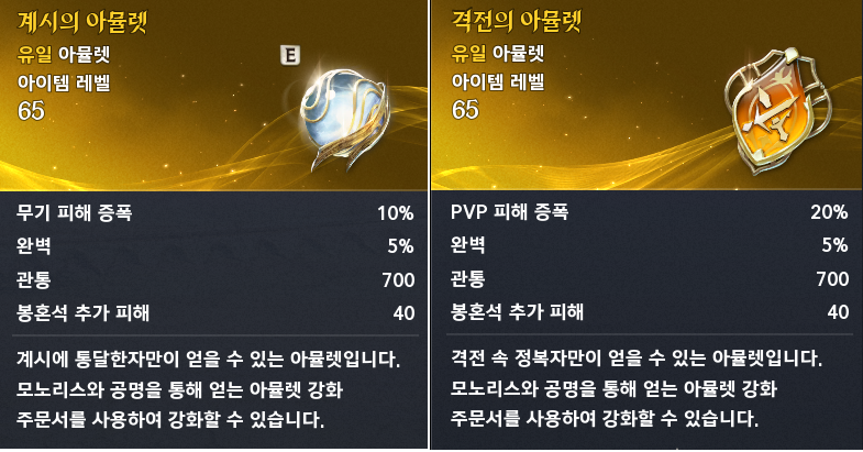 아뮬렛은 PvE와 PvP 두 종류만 존재하는 고정 장신구입니다.