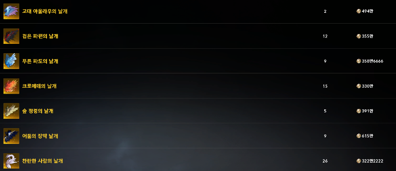 현재 대부분의 유일 날개는 💰 거래소 기준 약 300만 ~ 500만 키나에 구매 가능합니다.