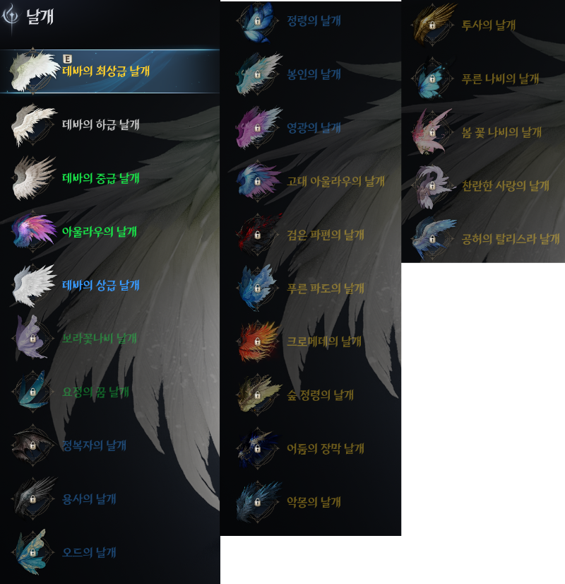현재 게임 내에는 여러 종류의 유일 등급 날개가 존재하며,