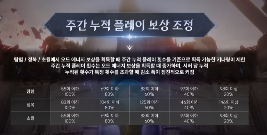 - 탐험, 정복, 초월에서 오드 에너지 보상을 획득할 때 주간 누적 플레이 횟수를 기준으로 보상이 제한됩니다.