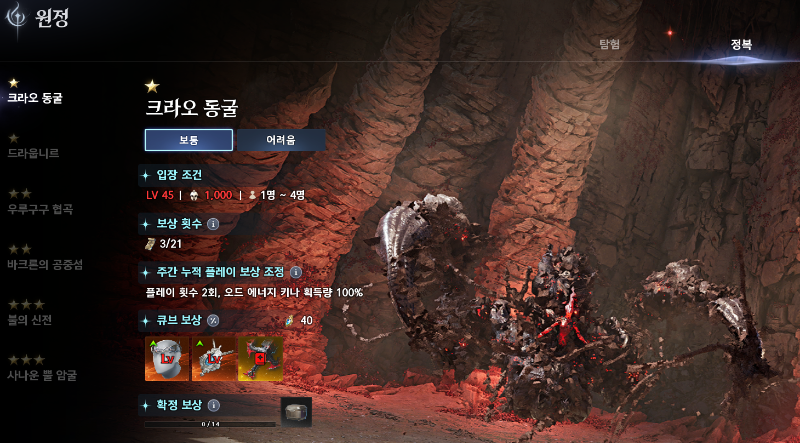 - 크라오 동굴 (입장 조건: 레벨 20), 불의 신전 (입장 조건: 레벨 35)에서 자원을 얻는 것도 좋은 방법입니다.