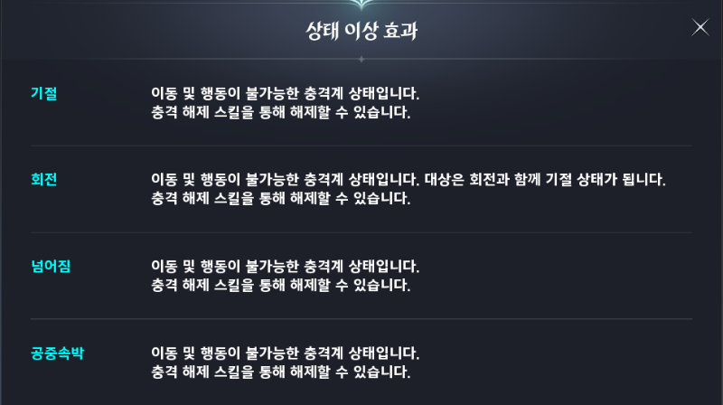 | 🤕 넘어짐 | 충격계 | 이동 및 행동 불가 | 충격 해제 스킬 |