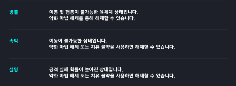 | ❄️ 빙결 | 육체계 | 이동 및 행동 불가 | 약화 마법 해제 |