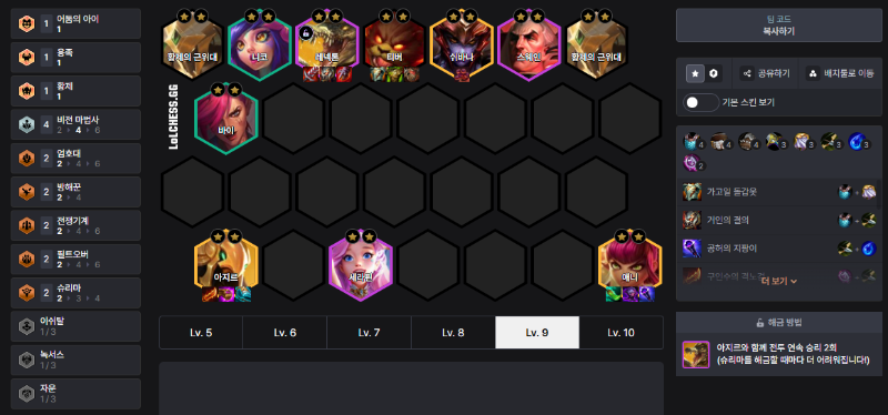 초반에는 요들 계열을 활용해 손패를 안정화하고, 중반 이후 강력한 오오라 효과와 고단계 챔피언으로 전환하는 구조입니다.