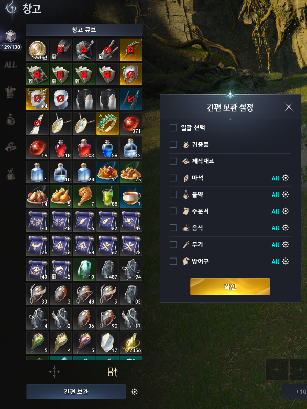 3️⃣ 간편 보관 대상 아이템을 설정한 후 ‘확인’ 버튼을 누릅니다.