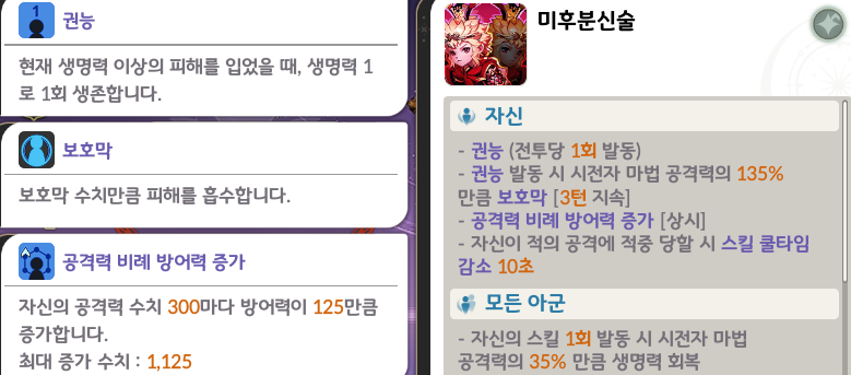 (공격력 300당 방어력 125, 최대 1,125) - ⏳ 피격 시 스킬 쿨타임 10초 감소