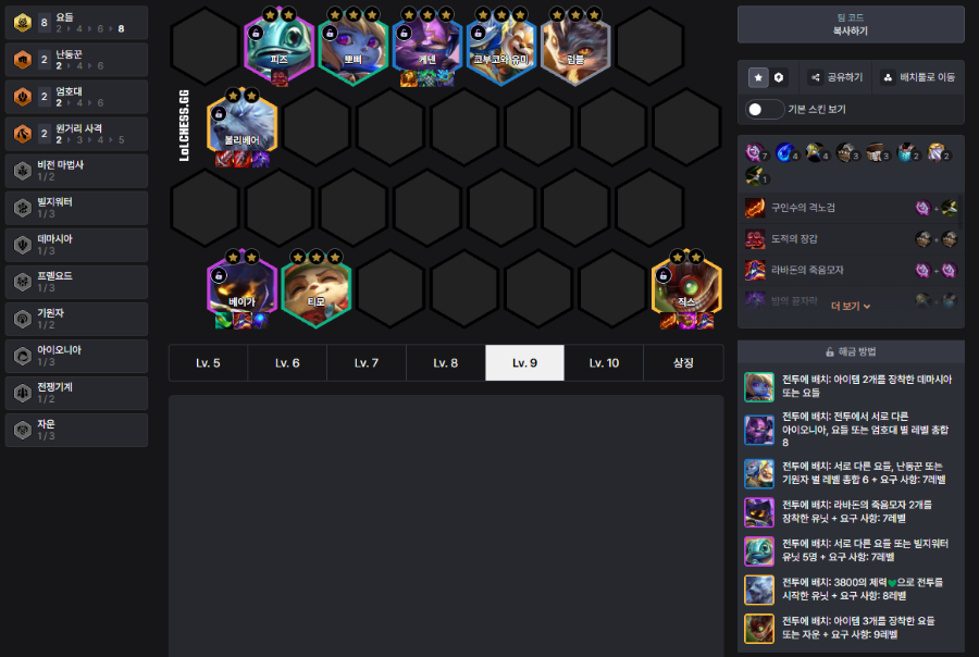 🧩 이 덱은 빠르게 레벨을 올려 8요들 특성을 활성화하는 것이 핵심 전략입니다.