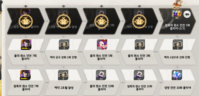 - 최초 성장 던전 1회 클리어 → 백각 1장 획득