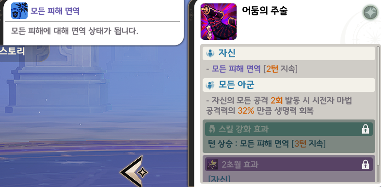 패시브 스킬 ‘어둠의 주술’은 전투 초반 자신에게 모든 피해 면역 2턴을 부여합니다.